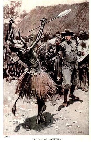 Leaving the hall, I entered the dining-room; and the moment I did so it became apparent that I had arrived upon the scene of the last stand of the little garrison, where the final phase of the stubborn and protracted attack and defence had been fought out. For the room was in a terrible state of confusion, the scattered remains of the heavy furniture showing that the savages had actually succeeded in forcing the barricade and gaining an entrance—this evidence being confirmed by the presence of nine Tembu corpses piled up in the window opening. And within arm’s length of them lay another corpse—that of my father, still grasping in his right hand the trusty cavalry sabre that had served him so well in his campaigning days, while his left held a pistol. Three Tembu spearheads in his body, one of which had evidently passed through his heart, told how he had died. A few feet away, right up against the front wall, I noticed a pile of scorched, brittle stuff that, as I cautiously probed it with the barrel of my rifle, proved to be burnt rugs. The three upper layers were burnt to a cinder, but the fourth was only scorched, while the last was scarcely singed; and beneath this lay the body of my mother, the flesh slightly darkened by the smoke of the burnt woollen rugs, but otherwise not disfigured at all. A bullet hole in the very centre of her forehead told me all that I wanted to know; and while I cast myself on my knees in the ashes beside that beloved form, a tempest of dry sobs rending my bosom as I realised for the first time all that I had lost, I felt thankful that my father had found the courage and resolution at the last moment to save her, even though by such dreadful means, from falling alive into the hands of the fiendishly ferocious Tembu.