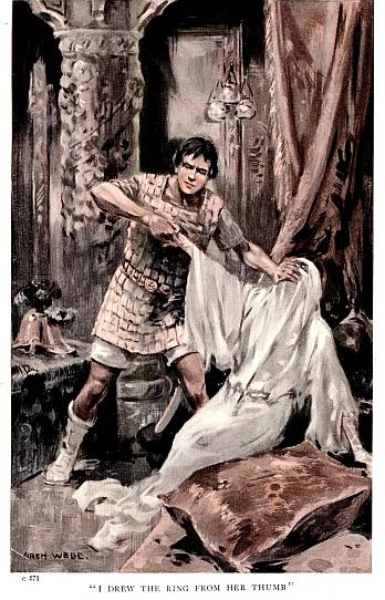 Although I had not the smallest belief in the woman’s power to destroy my cattle by any alleged occult virtue pertaining to her wonderful ring, the sight of it flashed before my eyes in so provocative a manner reminded me of my almost forgotten promise to Siluce to take the jewel from Bimbane, if I could; and, exasperated at last beyond endurance by her abuse and threats, I sprang to my feet, seized her right hand in mine, and, while I stifled her cries for help with my left, drew the ring from her thumb and thrust it upon my own little finger, animated by some sudden impulse for which I could not in the least account.