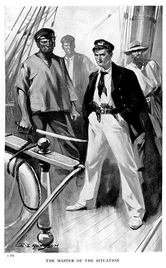 Bainbridge, with his peaked cap thrust aggressively to the back of his head, his brass-buttoned blue serge jacket opening to display his white shirt and flowing black silk necktie, and also, incidentally, a brace of revolvers, suggestively stuck in the broad elastic belt which girt his waist, and with a smile of insolent triumph upon his dark, saturnine, but otherwise rather good-looking face, stood alone at the break of the poop, with both hands thrust deep into his trousers pockets and his white-canvas-shod feet planted wide apart, watchfully regarding the proceedings on the main deck beneath him; while the whole of the crew, with the exception of the cook and the five men who constituted our especial bodyguard, were drawn up athwart the deck and along the face of the poop structure, each man armed with a rifle, and with a sheathed cutlass girt about his waist. Captain Roberts and Mr Bligh stood together at the open lee gangway, through which and above the lee rail could be seen the tossing masts of the longboat.