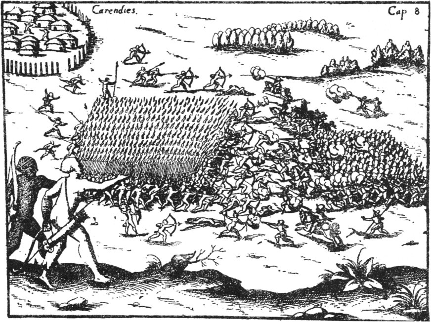Der Verkehr mit den Eingeborenen, den Kerandís, war anfangs friedlich; als diese aber einmal nicht ins Lager kamen, wurde der Oberrichter Pavón mit zwei Knechten zu ihnen geschickt, »hielten sich aber dermaßen, daß sie alle drei wohl abgebläut wurden und schicktens alsdann wieder heim in unser Lager«.