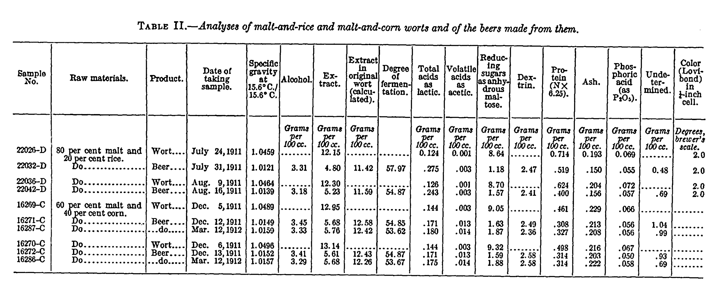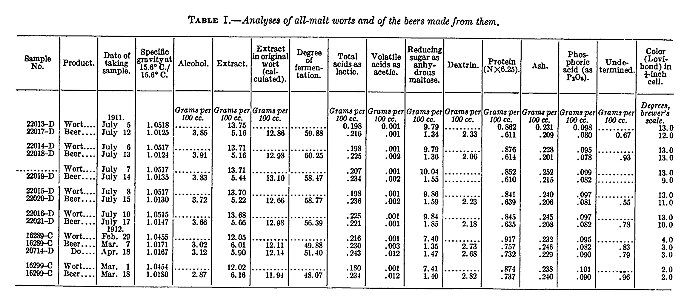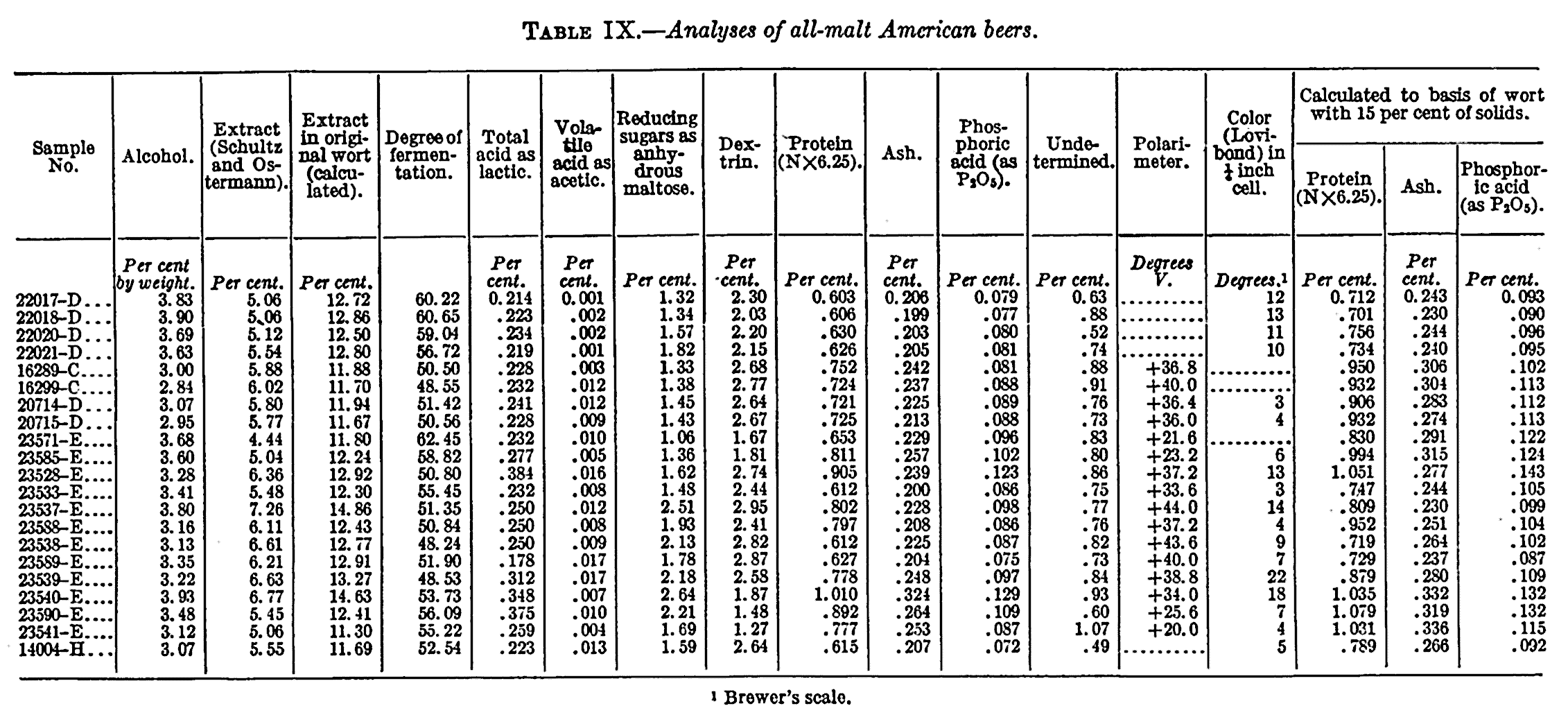 The investigation seemed desirable for the reason that practically all of the existing data related to foreign beers, in the preparation of which a type of malt was used entirely different from that ordinarily used in the production of American beers. Furthermore, very few of the existing data relating either to foreign or domestic beers were based upon samples concerning which exact information was available in regard to the raw materials used in the wort. [Pg 2]