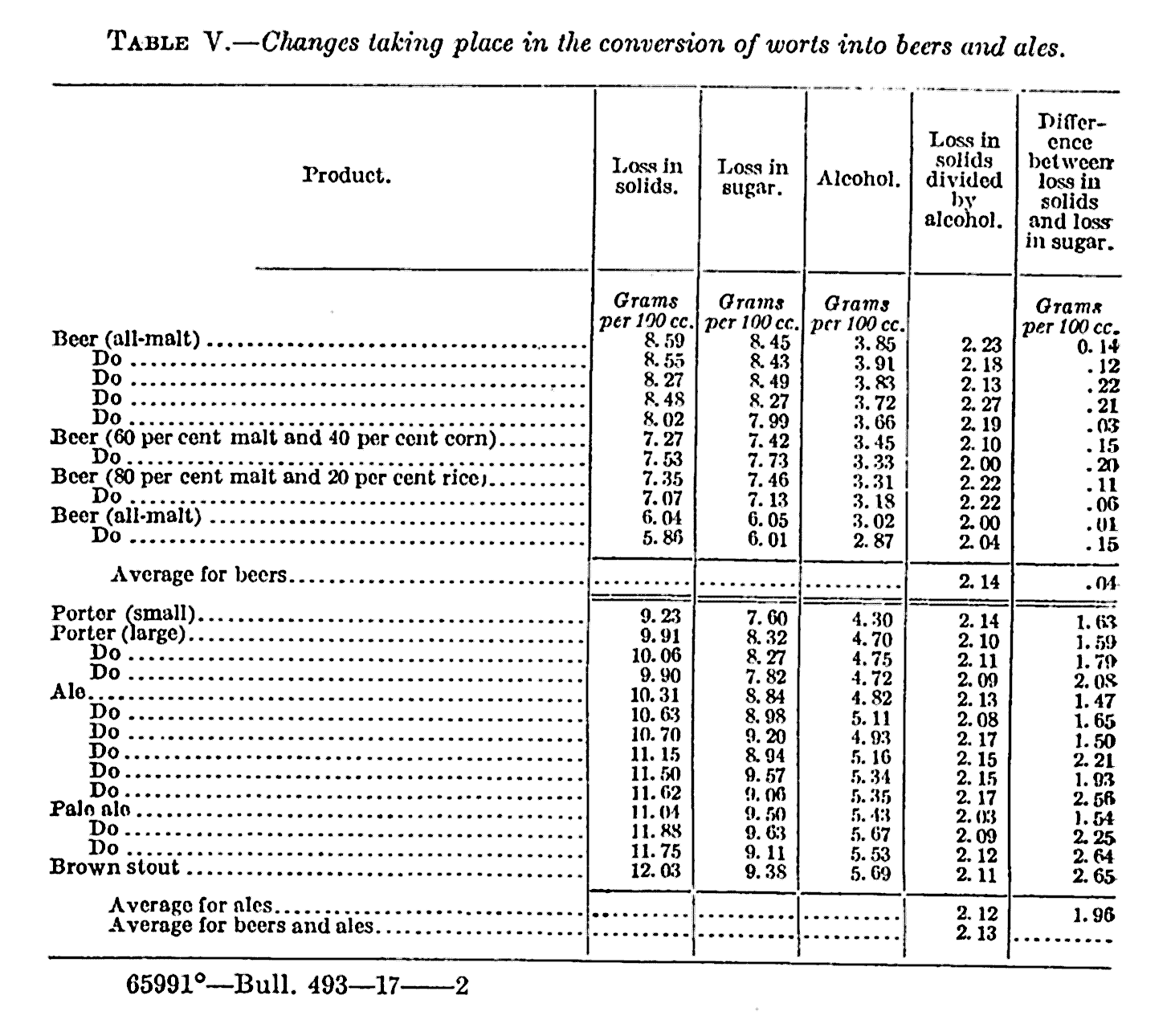 It was found in the estimation of dextrin by the Sachsse-Allihn method (ibid., p. 91) that there is an error in the method of calculation of the amount of dextrose formed from the amount of maltose in the original beer. Instead of multiplying the amount of maltose in the original beer by the factor 0.9, it should be multiplied by the factor 1.053, as 1 gram of anhydrous maltose yields, on hydrolysis, 1.053 grams of dextrose. The product is the quantity which should be subtracted from the total amount of dextrose found after hydrolysis. The extract in the beer was determined by use of the tables of Schultz and Ostermann (ibid., pp. 209-213). The same methods were used in the analyses of the worts as were used in the examination of the beers.