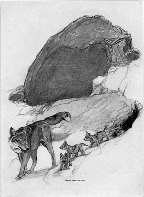 Breed urged Shady on, but in three miles the wolf family was forced to lay over for a rest. Here a pair of coyotes overtook them. The slow march was resumed with frequent halts for rest, and before morning two other pairs of coyotes caught up with them, and these were all members of the original pack that had hunted together in Sand Coulee Basin. Just at dawn the dog coyote Breed had met some time earlier in the spring brought his she-wolf mate and joined the band. All of the new arrivals had lost their pups through the efforts of the hound that Breed had slain, and they were free to follow where the leader willed.