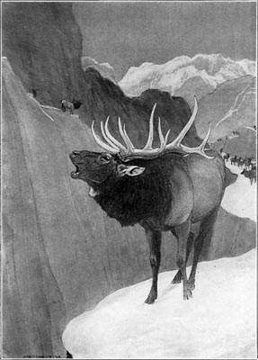 One day when the pups were a month old and had recently been out for their first romp Breed hunted across the divide and down the western slope of the Kootenais. He stood on a ridge in the gathering dusk when he was suddenly aware that other hunters were abroad before him. His eye caught flashes of white through the green of the spruce on the opposite slope. He knew that a band of deer had been startled to sudden flight, that the jerky gleams of white were the brief exposures of the underparts of their tails as they were upflung in hurdling windfalls. The wind was wrong and Breed could not catch the190 scent. He traced their course through the timber by their white flags and saw three deer break cover and start out across a long narrow opening on the slope, the path of a snowslide that had stripped a lane through the trees on the steep side hill, its trail a clean split in the solid green of the spruce. In the center of the slide the lead deer suddenly collapsed and the sharp report of a rifle rolled across the hills.