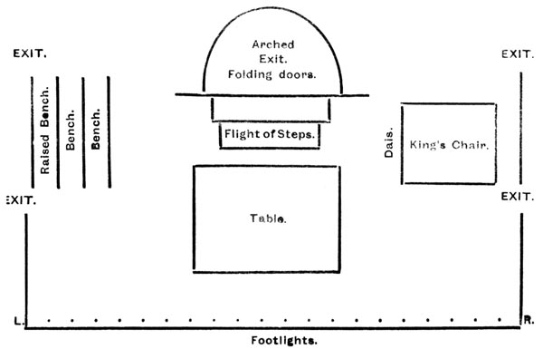 One day a paragraph appears in the papers that a new piece will shortly be produced at such and such a theatre. Paterfamilias lays down the paper and placidly observes that it may be worth while getting seats. Then he goes down to the theatre, books seats, and troubles himself no more about the matter until the first night of the play in question. The world behind the curtain is one with which he is totally unfamiliar. He knows naught of its struggles, its hopes and fears, its arduous work, its magnificent prizes and sore disappointments. So many thousands of pounds have been spent in preparing the play, so many reputations are at stake, so many hearts will be gay and glad to-morrow, or aching with the bitter pain of defeat. But to Paterfamilias these are all the joys or sorrows of another world. As he watches the smooth, easy performance, in which every actor has his place, in which the whole pageant produces itself without apparent effort, he fails to imagine the ceaseless work involved in its adequate realisation. He does not know that for weeks before the production of a new play, say at the Lyceum for instance, Mr. [Pg 124] Irving and the wonderful company which he has gathered round him labour over it often far into the night after the audience has left. The general idea of an actor’s life is that it is a delightful round of social pleasures tempered by a few hours’ light, agreeable work in the evening; to those who think this, a visit to the Lyceum rehearsals would reveal the other side of the shield. Very few men in London labour so indefatigably as Mr. Irving. To watch him directing a rehearsal almost makes one’s head ache at the mere idea of such unceasing labour. Every motion, however insignificant, of each individual on the stage, from himself down to the newest and rawest “super,” has to be thought out and planned in Mr. Irving’s brain. Like an ideal general, he leaves nothing to chance, nothing to subordinates. The turning up or down of every gas jet, the movement of every piece of furniture, the effect of every note of music, has received his most careful thought. One watches him stand hour after hour on the Lyceum stage, without weariness, without impatience, guiding the whole of the great production. And though Mr. Irving never spares himself, he is very considerate to others. When, for instance, a young actor is unable to comprehend the full meaning of an explanation, Mr. Irving walks up and down the stage, one arm on his shoulder, and explains the whole conception of the part. He is not only a great actor, but a great teacher; and his influence pervades and dominates every being in the theatre. He does not merely assert, but gives full and sufficient reason for every action until every one on the stage grasps the exact [Pg 125] meaning of the scene as well as he does himself. As an instance of this, let us follow the rehearsals of “Becket.”