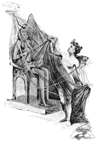 The murderers go “off,” and Mr. Terriss and Mr. Irving practise a series of different attitudes for the death scene until Mr. Irving is finally satisfied. He has taken off his coat in order to better rehearse the murder scene. Mr. Terriss now helps him on with it again, the monks are recalled, and some dozen more painstaking attempts made to get everything right. “It’s very simple, gentlemen,” Mr. Irving assures the monks. “Very simple, when you’ve once caught the spirit of it.” This rehearsal has lasted for nearly three hours, during the whole of which time Mr. Irving has superintended everything, thrown himself into each man’s part, grouped everyone, created the action, devised suggestions for scenery, as if regardless of the fact that in the evening [Pg 132] he will have to undergo the awful stress and strain of King Lear. Any other man, with a less intense vitality, would simply collapse under all this pressure. Mr. Irving puts up his eyeglass, takes a last look at the stage, and walks buoyantly off as if the whole thing were mere child’s play.