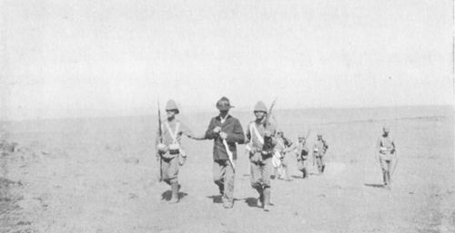 In the evening orders suddenly came for Limpus' battery of 4.7's, my two 12-pounders, and Richards' four 12-pounders to advance the next morning (12th) at 4 a.m. to Chieveley, some seven miles from the Boer lines; and here again I was in luck's way as being one of the fortunates ordered to the front. All was now bustle and hurry to get away, and eventually the line of Naval guns, some two miles long with ammunition and baggage wagons, moved out in the gray of morning over the hills, with an escort of Irish Fusiliers, who looked very smart, "wearin' of the green" in their helmets.