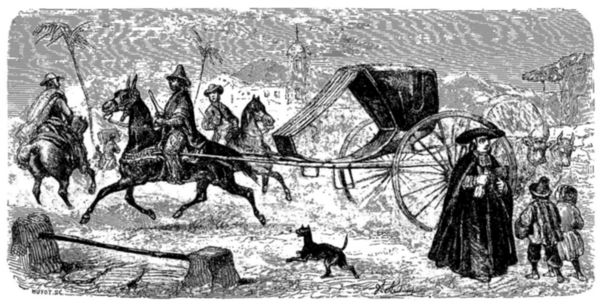Les rues sont si serrées et les maisons bâties si près les unes des autres, qu'on croit être plutôt entre deux murs que dans une rue. Il semble impossible que deux voitures puissent passer de front; elles le font pourtant, mais il y a constamment des embarras de voitures. Dans certains endroits, des voiles sont tendues sur la rue entière, de maison en maison, et l'on passe sous une longue tente. Quel étrange véhicule que la volante! une paire de longs et minces timons; à un bout, une paire d'immenses roues, à l'autre, un cheval avec sa queue tressée, relevée et attachée à la selle; une chaise ouverte appuyée sur les timons, à un tiers de la distance des roues au cheval; sur le cheval, un nègre avec de grandes bottes de postillon, de longs éperons et une brillante jaquette: voilà la volante. C'est un véhicule commode pour celui qui s'y trouve, mais il doit être sensiblement pénible pour le cheval. Nous rencontrons en passant des volantes de maître, distinguées par de riches ornements d'argent et la livrée des postillons; quelques-unes ont deux chevaux; l'argent, la livrée, et les longs timons, qui se balancent, une étrangeté générale, leur donnent quelque chose de plaisant. Dans la plupart, on voit un monsieur à demi couché, le cigare à la bouche; dans (p. 355) d'autres, un flot gonflé, de mousseline bleue ou rose, étendu des deux côtés jusqu'aux timons, et derrière, quelque indice d'une tête vivante.