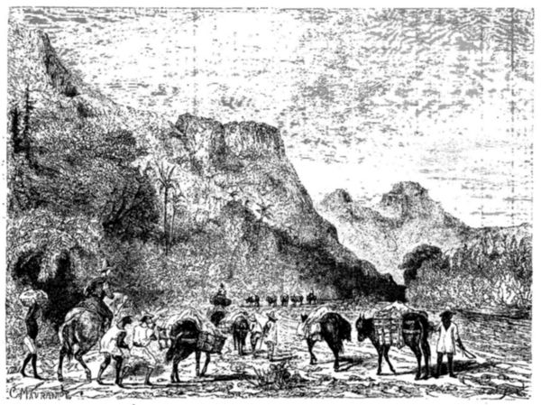 Revenu à Matanzas, je vais visiter la montagne du Cumbre. Je pars à cheval avec un noir pour guide; nous nous élevons peu à peu au-dessus de la ville. La baie, les maisons, le port, sont à nos pieds; le Pan s'élève, dans la distance, à la hauteur de mille mètres. L'Océan est devant nous, et derrière la paisible vallée de l'Yumuri; je reviens par cette pittoresque vallée, sans avoir le temps de visiter aucune des cavernes à stalactites qui y sont très-nombreuses et très-profondes.