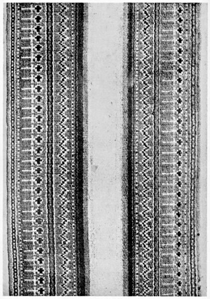 The selvedge F on the one side of the cloth and not on both sides is also interesting from the fact that selvedges do not appear on the Egyptian cloths until the XVIII. Dynasty circa B.C. 1600.