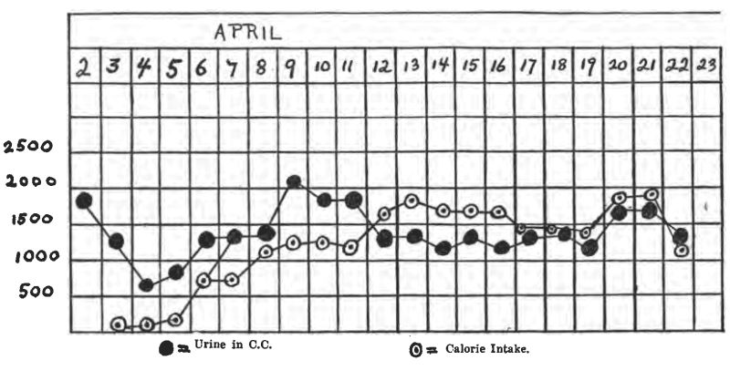 Two charts are kept for each case: one a food chart, with the amounts of the different articles of food taken each day, and the protein, carbohydrate, fat and caloric value figured out for each foodstuff; the second (see below) a more general chart, which shows graphically the progress of the case.