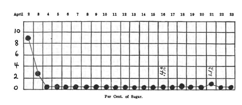 On April 21, on the same diet, she excreted 1.1% sugar. The next day her oatmeal was cut to 2 tablespoons, giving her about 10 grams less carbohydrate. No glycosuria. She was discharged April 24, sugar-free on