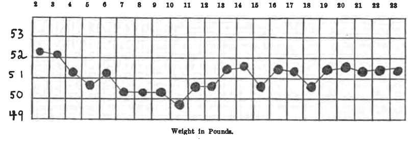 At entrance she weighed 56 pounds, at discharge 54, and lost 4 pounds during starvation, part of which she gained back again. On the diet which she was taking at discharge, she was just about holding her weight. She never excreted much acetone or diacetic acid, and when she was discharged there was merely the faintest traces of these in the urine.