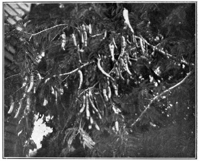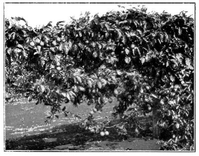 This fruit is very closely related to the granadilla, but is much hardier than it, and can be grown to perfection much further South. It is not injured by frost to any extent in any part of coastal Queensland, and can be grown a considerable distance inland. It is more rightly a semi-tropical than a tropical fruit, though, as it is so nearly related to the granadilla, I have included it amongst the tropical fruits. It is also a vine, and, when grown commercially, is trained along a horizontal trellis, in a somewhat similar manner to a grape vine. It is readily grown from seed, and will produce fruit in less than twelve months from the time that it is planted, and will continue to bear fruit for some years. It does best on a free, warm soil of fair quality, though it may be grown anywhere with care, and often thrives well in very poor soils with the addition of manure. It is found growing wild on the borders of many of our scrubs and elsewhere, the seeds having been deposited by birds or other agencies, and under such conditions it produces an abundance of fruit. The fruit is of a roundish oval shape, and is of a dark-purple colour. It is about the size of a large hen's egg, the outer skin being hard and shell-like, and the centre filled with the seeds, which are surrounded with a jelly-like mass and a yellowish pulp. It is a very fine flavoured fruit, and is universally liked. It is grown in considerable quantities in the Southern part of the State, and is one of our commonest fruits. It has usually two crops a year—a summer and a winter crop—but can be got to produce its fruit at any particular time that is desired by systematic pruning at different times of the year. It is often grown over sheds, dead trees, fallen logs, &c., which it covers with a mass of dense green foliage, and converts what would otherwise be an unsightly object into an ornament. The illustration herewith shows this well, and gives a good idea of the growth of a single vine. Commercially it is grown on trellis, so that the land between the rows can be kept well cultivated, and also to permit of ease in the gathering of the fruit. When ripe, the fruit drops, and the gathering is usually from the ground. The fruit carries well, but will not keep for any length of time, as it shrivels up. It is principally used as a fresh fruit, though it is also made into jam or jelly, and it often forms part of a fruit salad, taking the place of the granadilla. It has few pests, and is one of the easiest fruits to grow.