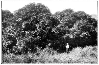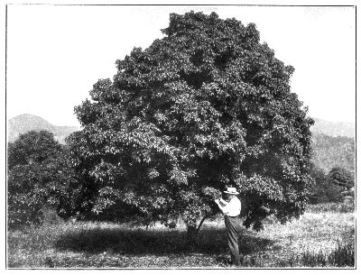The mango grows to a large size here, even when comparatively young. I know trees over 50 feet in height, having a spread of the branches of more than 60 feet, a main trunk nearly 3 feet in diameter, that are under thirty years old, and that have borne from 1 to 2 tons of fruit for a single crop. Hundreds of tons of fruit go to waste annually for want of a market, or are consumed by farm animals, as the consumption of the fruit is practically confined to this State, and the production is greater than we can consume, despite the fact that mangoes are in season from the end of September to March, and that they are a favourite fruit with all who have acquired a liking for them. In addition to the consumption of the fruit in its fresh state, a quantity is converted into chutney, but this is so small that it has no appreciable effect on the crop as a whole. The unripe fruit makes an excellent substitute for apples, and is used stewed or for pies or tarts, and when sliced and dried it may be stored and used in a similar manner to dried apples.