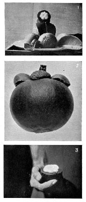 Many attempts have been made during past years to introduce this delicious fruit into Queensland, but these always resulted in failure. True, a certain variety of mangosteen has been successfully grown at Port Douglas, also on the Lower Burdekin, and rumours of the existence of the true Java mangosteen (Garcinia mangostana) have been received, but, in nearly every case, they have, on investigation, proved to be Garcinia xanthochymus, or some other species. At the Kamerunga State Nursery, however, trees of undoubted parentage were successfully raised. It is said that a thriving young plant, which is unquestionably G. mangostana, is owned by Mr. Banfield, of Dunk Island. The records of the Kamerunga Nursery show that in October, 1891, a quantity—about 100—of ripe mangosteen fruit was received from the Batavian agency by the then manager, Mr. Ebenezer Cowley, from which some 600 seeds were obtained. Of these, only a few germinated. The next mention is of the distribution, in February, 1892, of six plants to an applicant on the Mossman, and of two more in May of that year. Since then several young trees have been raised at the nursery, and one of them, in January, 1913, fruited for the first time for twenty-two years, and is the first to have done so in this State. Some of the fruit was sent to the Department of Agriculture and Stock, and proved to be fully equal to those of Java. A full history of the mangosteen and of its introduction into Queensland is given in "The Queensland Agricultural Journal" (vol. xxx., June and July, 1913). The photographs were taken from the original fruit.