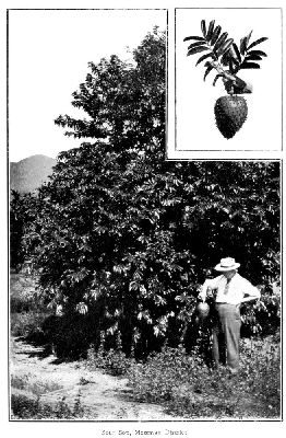 Under this heading I will include all the Anonas, such as the sour sop, sweet sop, bullock's heart, and cherimoya. The sour sop is purely tropical, and is very sensitive to frost, but the other species are by no means so tender, and can be grown anywhere along the coast where the soil is suitable, as well as at many inland places. All the species produce very fine fruits, that vary somewhat in shape, in the roughness of the skin, and in size. The sour sop is the largest, and attains a size of 6 to 8 lb. The fruit is covered with soft spines, and is of an irregular oval, or even pyriform, shape. It ripens very soon after it is gathered, consequently cannot be sent any distance. It is a pleasant fruit of an aromatic sub-acid flavour. The pulp surrounding the seeds is of a woolly consistency, and this is surrounded by a custard-like mass which is much appreciated by those who have acquired a liking for it. It is a comparatively uncommon fruit, and is confined to the tropics.