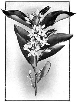 Quite a number of fruits are included under this heading, and all reach a very high state of perfection in this State. The whole of the family, the lemon-shaped citron excepted, is noted for the beauty and symmetry of growth that its trees make, and I know of few more beautiful sights in the vegetable world than a well-kept citrus grove in full bearing. Take the common round orange as an example, its well-balanced and evenly grown head, its dark glossy green foliage, its wealth of white blossoms, which perfume the whole neighbourhood, or its mass of golden fruit between its dark-green leaves, render it one of the most beautiful of fruit trees at all times, but especially so when covered with blossoms or ripe fruit. A typical Queensland grove is even more beautiful than those of many other places, as the vigour and size of our trees, their exceptionally healthy appearance, their dark foliage, and the heavy crop of high-class fruit that they bear, are at once evident to a stranger who has never seen the orange grown under such favourable conditions as are experienced here. The yield is often so heavy that the trees actually bend to the ground with the weight of their fruit, and a stack of props has to be used to prevent the tree from splitting into pieces. Those who have seen the enormous crops of apples that are produced on some trees in Tasmania or the old cider orchards of Devon or Somerset can form an idea of the crops; but the writer, who has seen both, as well as our Queensland trees, has no hesitation in saying that a Queensland mandarin can give points to either as a heavy cropper; in fact, if it has a fault, it is its proneness to overbear, particularly when young. This all tends to prove how well adapted Queensland is to the growth of citrus fruits, and were I asked to select a country particularly suited to their culture I should have no hesitation in naming this State, as I know of nowhere where their culture can be carried out with less trouble, or where the trees will produce better fruit or heavier crops. Queensland may well be termed the home of citrus fruits, as we have no less than three native species which are indigenous to the State, and are by no means uncommon in our scrubs. Their presence gives unmistakable proof of the suitability of this State for the culture of fruits of the same family, so that I think a short description of these native species may not be out of place, but will be of some interest to my readers.