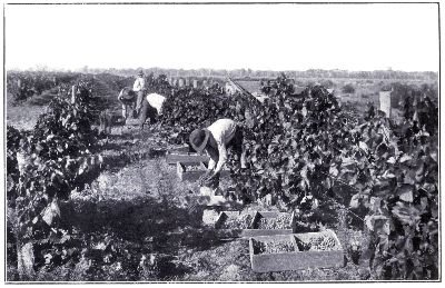The case berries, which are used for fresh consumption, fetch a fair price, especially early in the season, but jam fruit sells at an average of 2-1/2d. per lb., at which price it pays fair wages, but is not a bonanza. As a rule the plants are very healthy, and any fungus pests to which they are subject, such as leaf blight, are easily kept in check by spraying, a knapsack pump being used for this purpose. The ground is kept well worked and free from weeds, whilst the plants are fruiting, and occasionally the ground is mulched, as is the case in the plot shown in the illustration. No special knowledge is necessary for their culture, but, at the same time, thorough cultivation and careful attention to details in the growing of the plants make a considerable difference in the total returns.