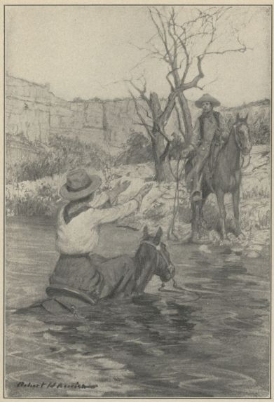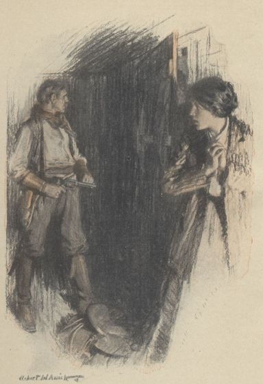 The pony’s gait had quickened into a gallop—which she could not check. In the past few minutes the darkness had lifted a little; she saw that the pony was making a gradual turn, following a bend in the river. Then came a flash of lightning and she saw, a short distance ahead, a pony and rider, stationary, 19 watching. With an effort she succeeded in reining in her own animal, and while she sat in the saddle, trembling and anxious, there came another flash of lightning and she saw the rider’s face.