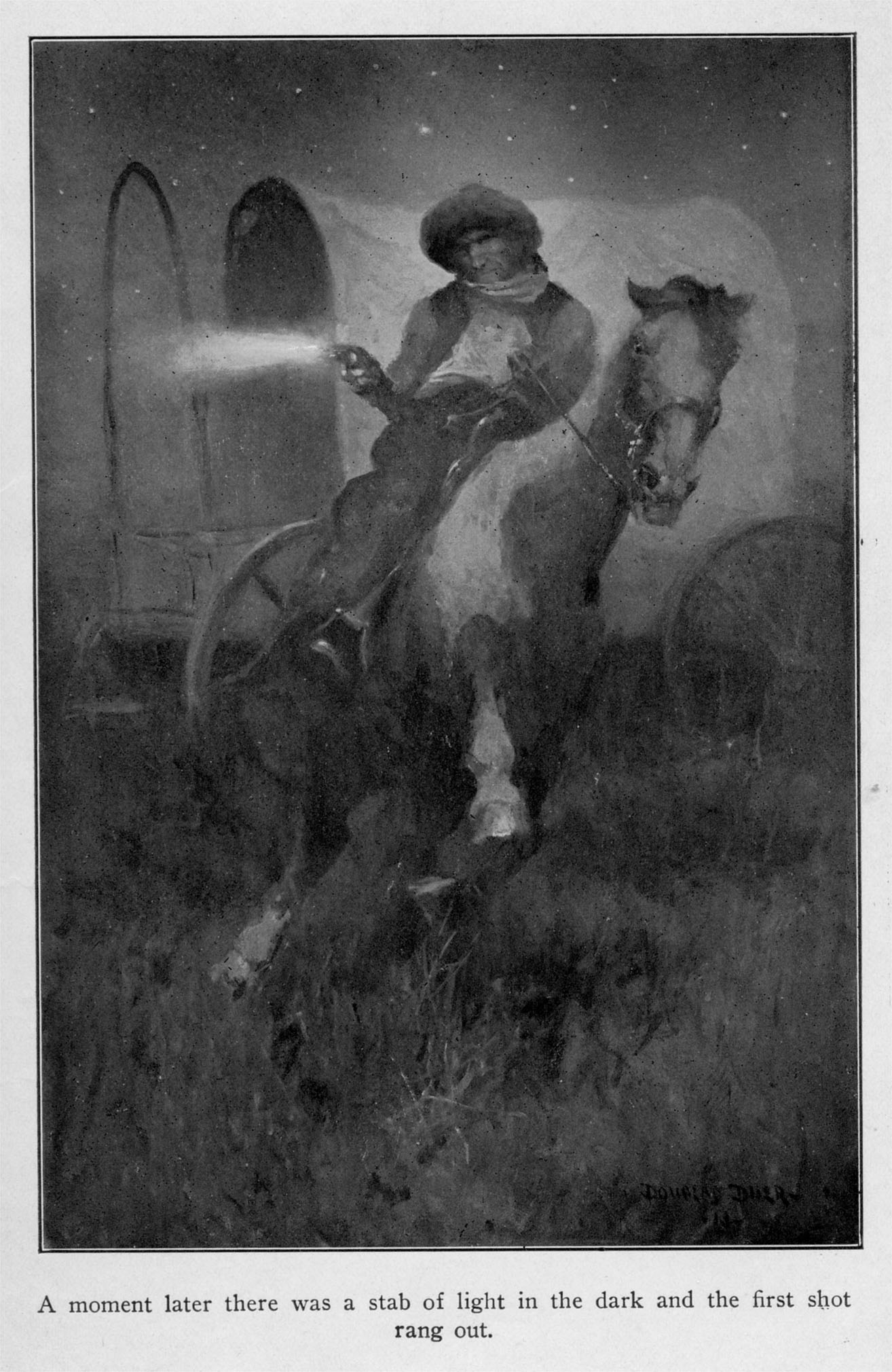 Had he been a suspected horse-thief, the unwritten social etiquette of the plains would have provided him with food and lodging as long as he cared to stay. Consequently when he had caught the reflection of the setting sun against the walls 13 of the ranch house, he had turned Pinte’s head in the direction of the corral.