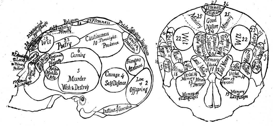 Perceptive Organs—The most marvellous feature of the old phrenological system, is the accuracy with which the smallest organs of the brain have been discovered, located, and described. The organs of Form, Size, Weight, Color, Order, and Number, or Calculation, were so accurately located and described by Spurzheim, that little remains to be said about them. Gall discovered only Form, Color, and Number, and the latter he located in the position which belongs to Order. These organs were but little developed in Gall, whose great success was due to his philosophic originality and independence. He was not a close observer, and there was a sternness in his nature which prevented him from accepting readily the suggestions of Spurzheim, who with less boldness of character and greater accuracy of perception, was better fitted for minute observation and anatomical analysis. His own cranium has been preserved, in which I found these perceptive organs distinctly marked by their digital impressions on the superorbital plate over the eye. It is a remarkable fact that the intellectual faculties have been most easily understood and located, while their antagonists in the occipital region have proved the greatest puzzle in psychic and cerebral investigations. Gall failed, and left a vacant space in the occiput. Spurzheim failed, but covered the ground incorrectly, and it was many years after I discovered cerebral impressibility before I attained a satisfactory view of the psychology of this region. The location and definition of Locality are substantially correct.