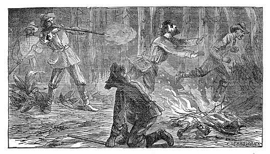 On mounting a hill about half a mile from the place where they had last seen the lone horseman, they came in sight of a camp-fire that appeared burning in the bottom of the ravine below. Both dismounted, tied their horses to the trees, and silently stole towards the light.