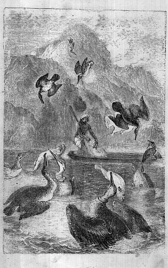 Although the man was standing up in his boat, and working his long pole over their heads, now on one side, then on the other, the birds appeared so tame that they did not heed his manoeuvres; and yet not one of them seemed to be fastened, but merely perched upon the edge of the skiff! Now and then one would stretch its long neck over the water, turn its head a little to one side, and then draw it in again, and resume its former attitude. Such tame birds had never been seen. No wonder the sight astonished the Bavarian boys. Both turned to Ossaroo for an explanation, who gave it by simply nodding towards the lake, and uttering the words—