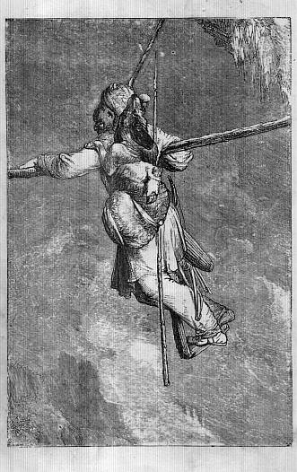 The sliced meat was removed—the raw hide was stretched out, and cut into thongs of about an inch in thickness, and these being knotted together, a rope was soon made that reached from side to side of the great chamber. The ends of this were fastened to the rocks; one was looped around a jutting point, and the opposite was held by being placed upon a little shelf with a heavy stone on top of it; and thus a line, something after the fashion of a clothes-line, was carried across the chamber.