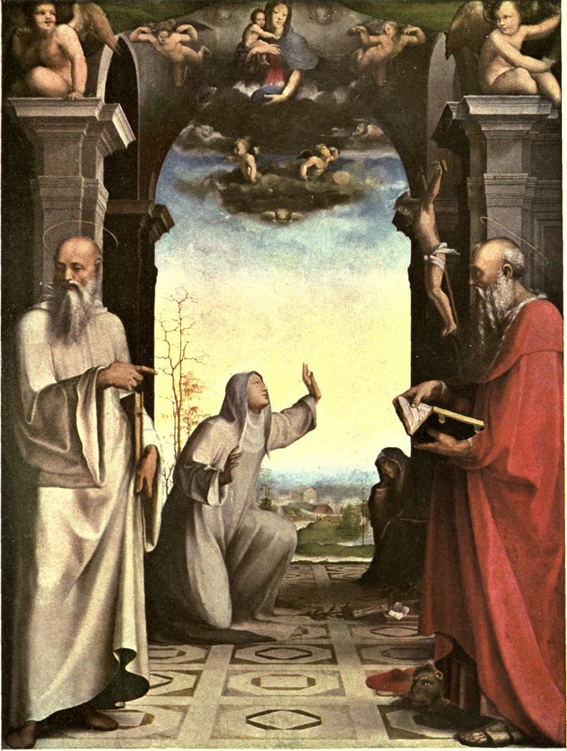 Domenico afterwards painted for S. Benedetto, a seat of Monks of Monte Oliveto, without the Porta a Tufi, an altar-piece of S. Catharine of Siena in a building receiving the Stigmata, with a S. Benedict standing on her right hand, and on her left a S. Jerome in the habit of a Cardinal; which altar-piece, being very soft in colouring and strong in relief, was much praised, as it still is. In the predella of this picture, likewise, he painted some little scenes in distemper with incredible boldness and vivacity, and with such facility of design, that they could not be more graceful, and yet they have the appearance of having been executed without the slightest effort in the world. In one of these little scenes is the Angel placing in the mouth of that same S. Catharine part of the Host consecrated by the priest; in another is Jesus Christ marrying her, in a third she is receiving the habit from S. Dominic, and there are other stories.