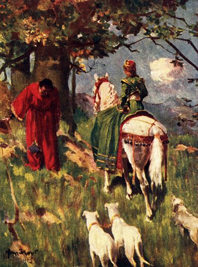 Next morning the Duke and his seven sons were going a-hunting, and the courtyard rang with merry laughter as one after another came out to mount the horses which the pages held ready for them. The ladies were on the terrace waiting to wave them good-bye, when, just as the Duke was about to mount his horse, his eldest daughter, whom he loved dearly, ran into the courtyard and knelt at his feet.