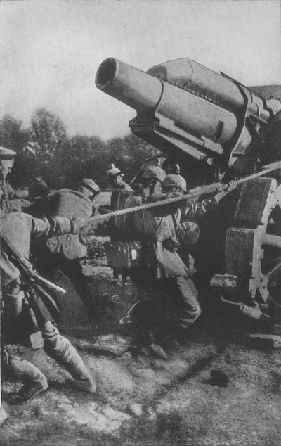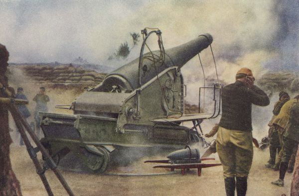 A great French siege gun in action near the much-contested battle field of Arras. During the terrific explosion the gunners cover their ears.