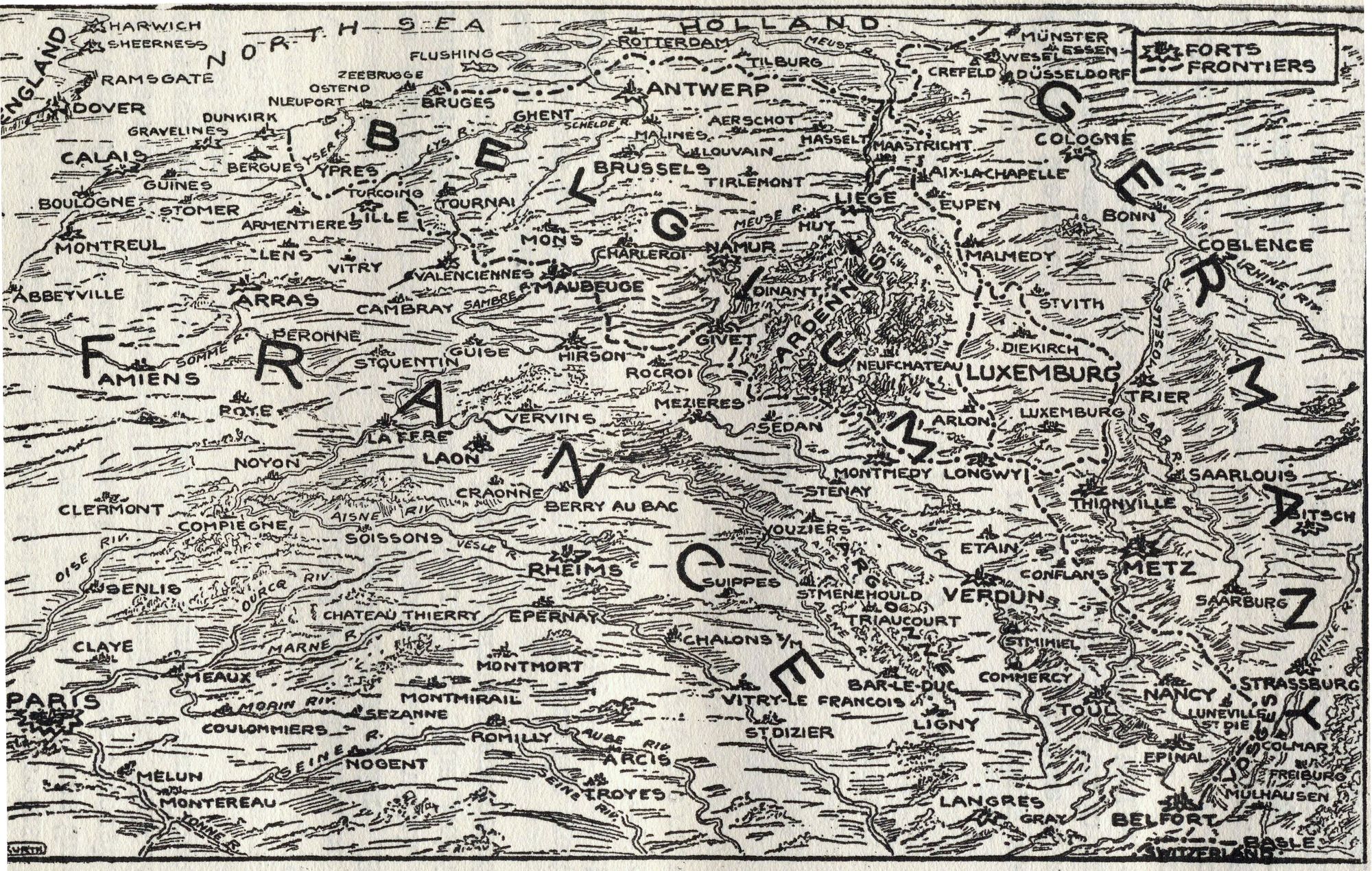 But he hoped within such time the French or British would march to his relief. Thus his chief concern was for the forts protecting the railway leading from Namur down the Meuse Valley into Liege—the line of a French or British advance.