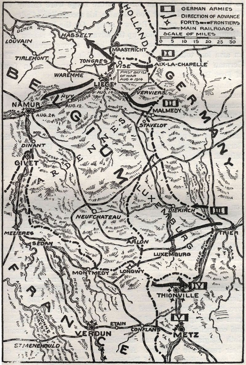 The long anticipated Day dawned. Their vast military machine moved with precision and unity. But there was a surprise (p. 012) awaiting them. The Belgians were to offer a serious resistance to passage through their territory—a firm refusal had been delivered at the eleventh hour. The vanguard was thrown forward from Von Kluck's army at Aix, to break through the defenses of Liege and seize the western railways. This force of three divisions was commanded by General von Emmich, one of them joining him at Verviers.