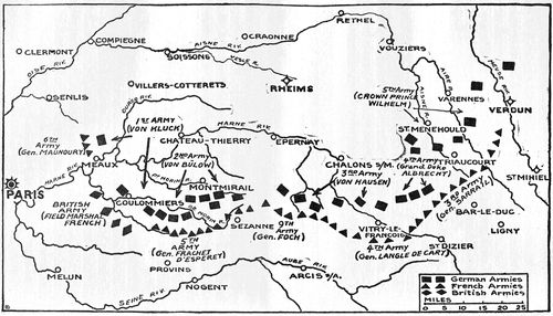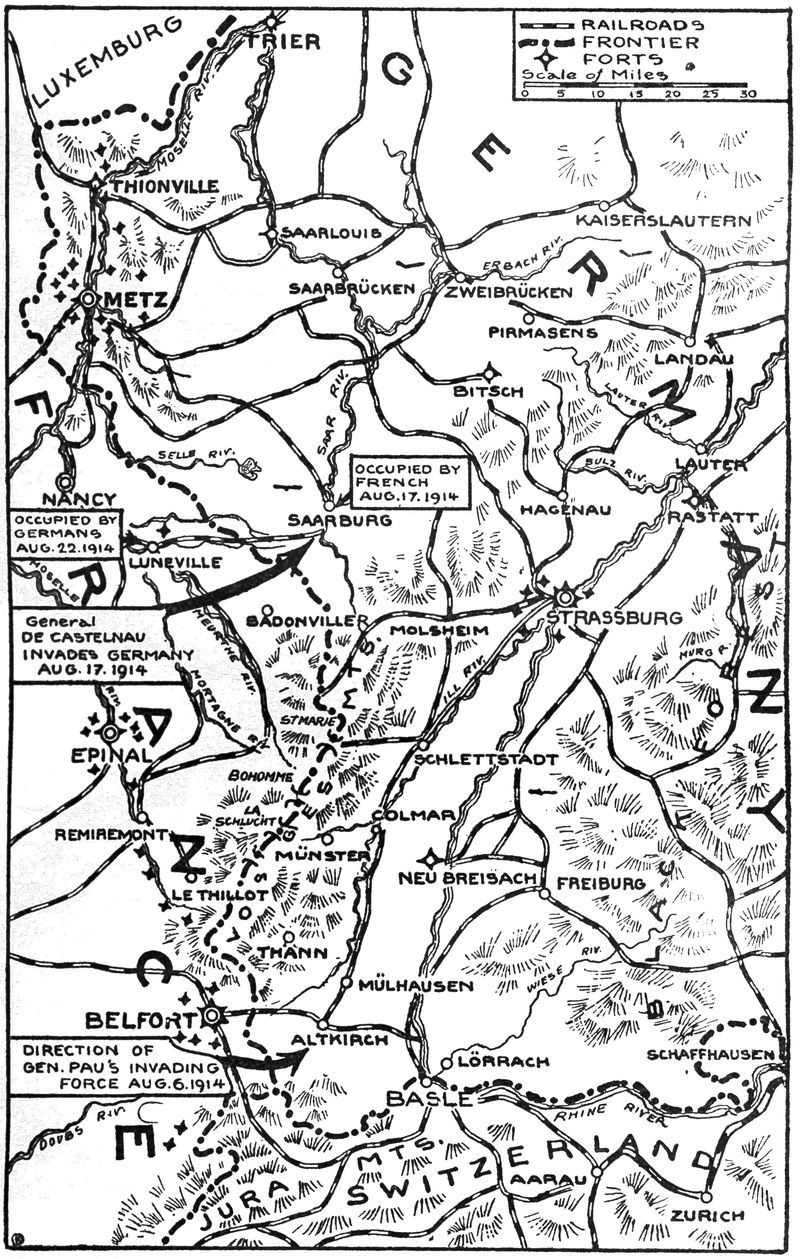 The main plan of the German General Staff, therefore was a wide enveloping movement by the First and Second Armies to sweep the shore of the English Channel in their march on Paris, a vigorous advance of the center through the Ardennes for the same destination, and readiness for battle by the Sixth Army for any French force which might be tempted into Alsace. That this plan was not developed in its entirety, was due to circumstances which fall into another place.