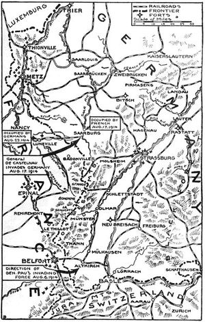 The Sixth Army was concentrated at Strassburg in Alsace, under General von Heeringen. As inspector of the Prussian Guards he bore a very high military reputation. For the time being General von Heeringen's part was to remain in Alsace, to deal with a possibly looked for strong French offensive by way of the Vosges or Belfort.