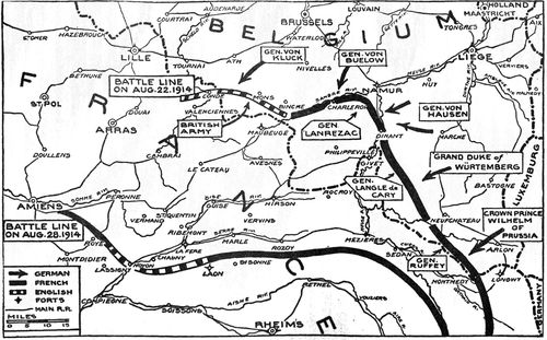 As we have seen, the resistance of Forts Boncelles and Loncin at Liege held back the main German advance from seven to ten days. Their fall released into German control the railway junction at Ans. With that was included the line from Liege up the left bank of the Meuse to Namur. Also, another line direct to Brussels.