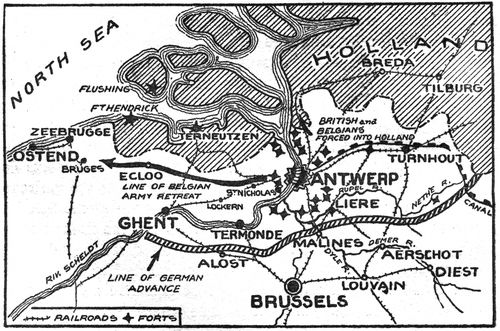 The end being merely a question of hours General Leman (p. 020) ordered the evacuation of the city by the infantry. He wisely decided it could be of more service to the Belgian army at Dyle, than held in a beleaguered and doomed city. Reports indicate that this retreat, though successfully performed, was precipitate. The passage of it was scattered with arms, equipment, and supplies of all kinds. An ambulance train was abandoned, twenty locomotives left in the railway station, and but one bridge destroyed in rear beyond immediate repair. After its accomplishment, General Leman took command of the northern forts, determined to hold them against Von Kluck until the last Belgian gun was silenced.