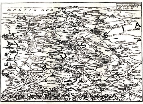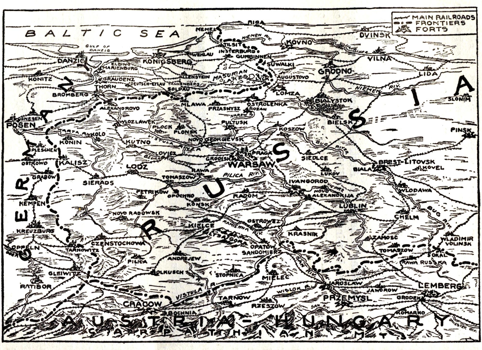 During the first three weeks of August, 1914, the Russian armies had invaded East Prussia and laid waste a large section of it. Then came the débâcle at Tannenberg, and by the middle of September, Germany was freed of the invader, who had lost tens of thousands in his attempt to force his way into the heart of the German Empire. Not satisfied with these results, the Germans on their part now attempted an invasion of large sections of West Russia, pursuing their defeated foes until they reached the Niemen and its chain of fortresses which they found insurmountable obstacles. It was once more the turn of the Russians, who now not only drove back the invading Germans to the border, but who by the beginning of October, 1914, faced again an invasion of their East Prussian province. However, less than (p. 491) two weeks sufficed this time to clear German soil once more, and by October 15, 1914, the Russians had again been forced back across the border. By this time the German Commander in Chief, Von Hindenburg, had learned the lesson of the Niemen. Instead of battering in vain against this iron line of natural defenses, he threw the majority of his forces against Poland, and especially against its choicest prize—historic Warsaw. October 11, 1914, may be considered the approximate beginning of the first drive against the Polish capital. During about two weeks of fighting the German armies advanced to the very gates of Warsaw, which then seemed to be theirs for the mere taking. But suddenly the Russian bear recovered his self-control, and with renewed vigor and replenished strength he turned once again against the threatening foe. By October 28, 1914, the Germans in North and Central Poland and the Austro-Hungarians in South Poland had to retreat.