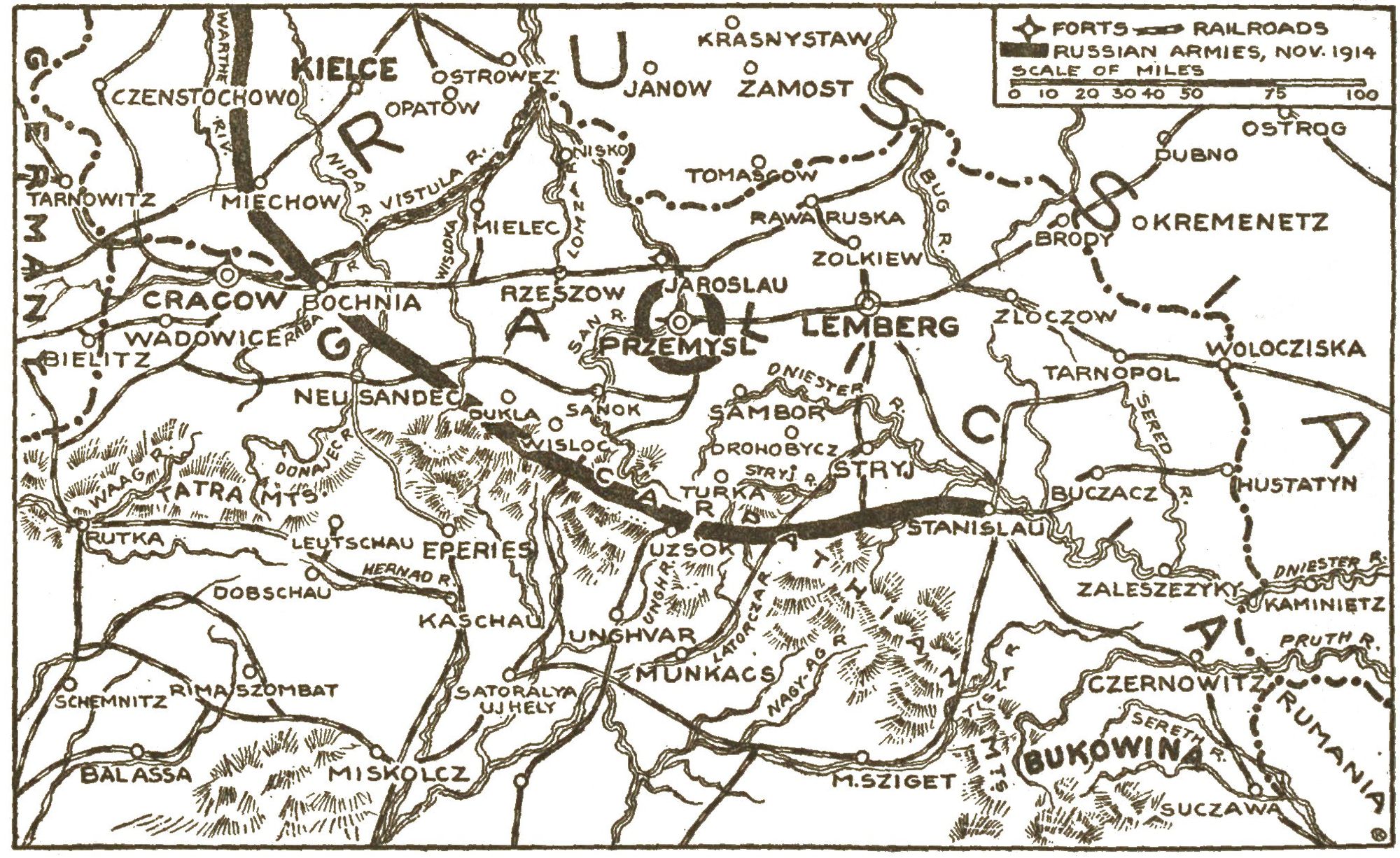 (p. 492) In the meanwhile the drive against Warsaw was making small progress in spite of the most furious onslaughts. There, too, a series of rivers and swamps—less formidable, it is true, than in East Prussia, but hardly less effective—stemmed the tide of the invaders. For more than two weeks, beginning about December 20 and lasting well into January, the Russians made a most stubborn stand along the Bzura and Rawka line, and successfully, though with terrible losses, kept the Germans from taking Warsaw. However, in order to accomplish this they had to weaken their line at other points and thus bring about the collapse of their drive against Cracow, by means of which they expected to gain from the south the road into Germany which had been denied to them again and again in the north.