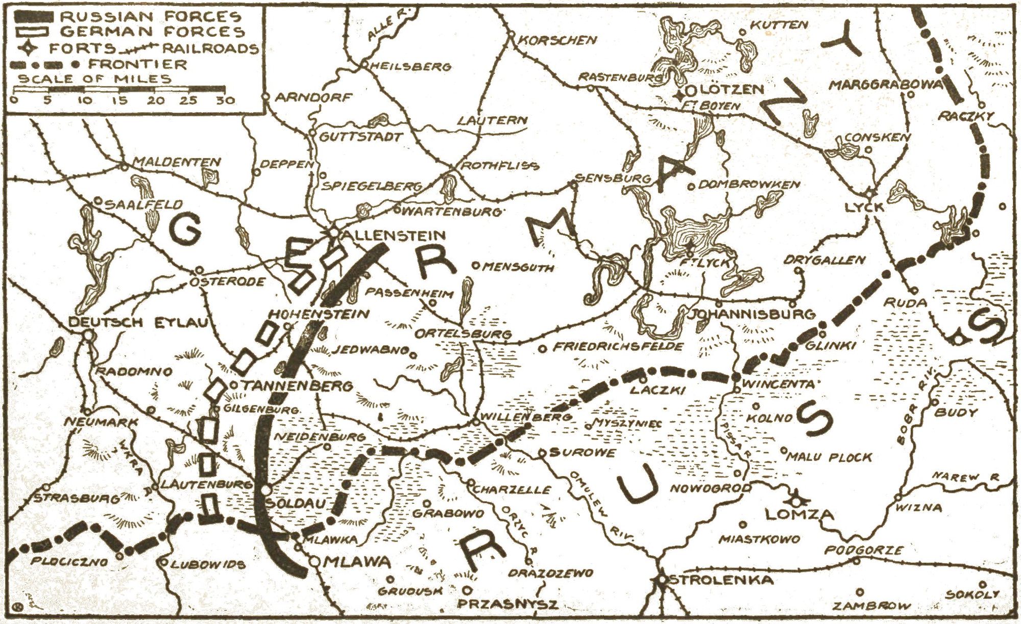 To the north of the central group—north of the Vistula and between it and the Narew—the Germans had assembled, as we have already stated, another group which had as its bases Soldau and Thorn. Their chief task was to protect the German provinces of West and East Prussia from a Russian attack from Novo Georgievsk and Warsaw.