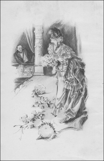 From the carriage the house was some distance, and 493 yet it appeared very near the gate to the soldier, who dimly realized he was passing through a garden where were many flowering plants and where the air was unusually heavy with perfume. Many other details, the construction of the house, the size of the verandas, passed without attracting his notice. Soon, however, he was seated in a great room, an apartment of old-fashioned height and breadth. He felt his heart beating fast. How long did he sit there? No inconsiderable period, surely. He examined everything carefully, without carrying a definite impression of anything to his mind. The large, carved mirror; the quaint decoration of walls and frieze; the soft colors of the rug that covered the floor; the hundred and one odd little things in the cabinet near the chair where he was seated, trifles in ivory, old silver and china; the pictures, a Van Dyke, Claude, and a few modern masters. After this interminable, but confused scrutiny of inanimate things, his heart beat faster still, as a tall figure, robed in white, entered the room!