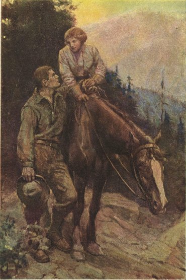 It was the day after the halt at the road house. Half-obliterated by the débris of snowslide and melting torrents, the trail was hard to follow. In some places the pack burros scrambled for a footing or skated awkwardly with tiny hoofs desperately set to check their descent, to be steadied and encouraged by the booming voice, deep as a bell, of the man nearest them. Sometimes in dangerous spots where shale slides threatened to prove unstable, his lean, grim face and blue-gray eyes appeared apprehensive, and he braced his great shoulders against one of the bulging packs to assist a sweating, straining animal. After one of these perilous tracts he stopped beside the burros, pushed the stained white Stetson to the back of his head, exposing a white forehead which had been protected from the sun, and ran the sleeve of his blue-flannel 23 shirt across his face from brow to chin to wipe away the moisture.
