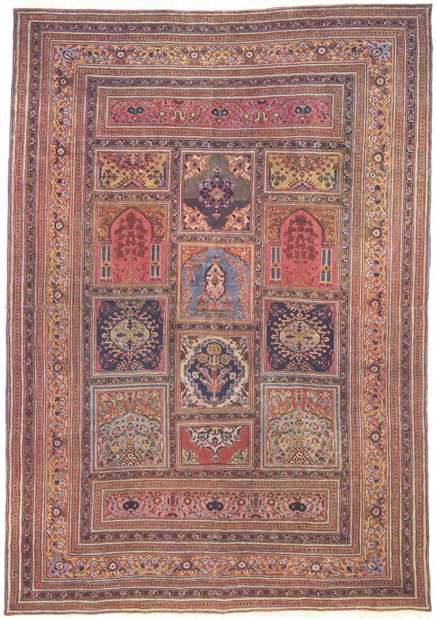 This interesting and valuable rug is of antique Tabriz weave, of finely blended colors, and rare design. It represents the individual squares on the floor of a mosque, each one of which may be occupied by a worshipper kneeling in prayer. Rugs with a single design of this kind are usual, but a grouping of many such spaces in one rug is rare. Forms of the Tree of Life are represented in different panels, and the border is very rich and handsome. The fabric is fine, the texture soft and firm. The rich and splendid hues of the various panels are so soft in tone that, while there are several different colors in juxtaposition, these have been arranged so deftly and artistically that the effect is perfectly harmonious. It is impossible to describe in words the mellow richness and rare art displayed in this unique product of the loom.
