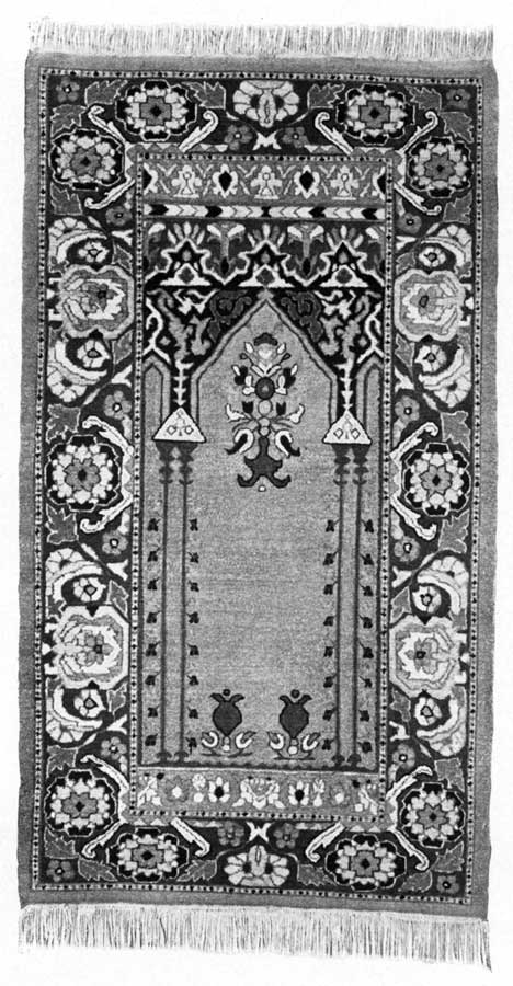 [A] Some prayer rugs have a representation of the hands of Mohammed, and on them the suppliant places his own as he throws himself prostrate. In the corners of some of these rugs pulpits are represented, and occasionally trees.