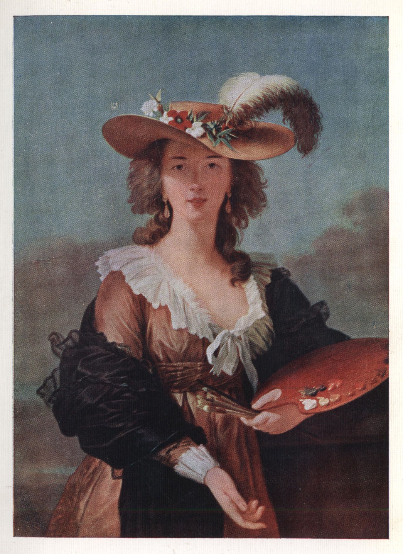She saw at Anvers the famous "Chapeau de paille" by Rubens. This canvas by Rubens clearly inspired her to the painting of the portrait of herself in a straw hat, where she stands bathed in the sunlight, her palette in her hand. The painting of the flesh of the pretty face is exquisite, and in spite of intense finish is broadly conceived and rich and glowing in colour. The clumsy drawing of the hand that holds the palette is the only defect in this, one of her masterpieces. The picture has the added interest of revealing to us how Vigée Le Brun set her palette. The thing is thrilling with life; and the little feminine conceit of wearing her black wrap is quaintly delightful.