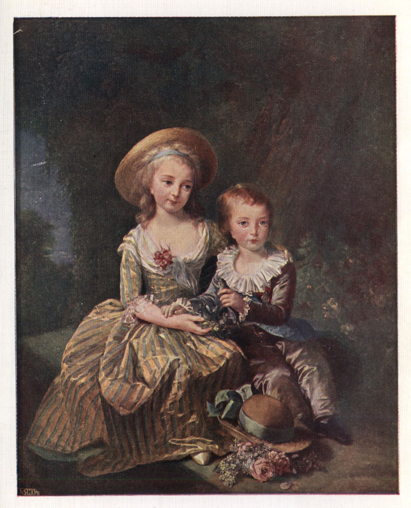 The little Dauphin of four years, and his seven-year-old sister, the Madame Royale, seated on a bank, the boy's hat thrown at his feet upon the flower-strewn ground—a work in which Vigée Le Brun's colour-sense, her fine arrangement, and her feeling for style reach to their highest flight. The handsome boy was mercifully taken at the dawn of the Revolution; the girl was to know all its terrors.