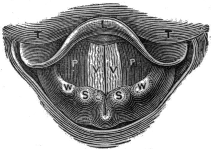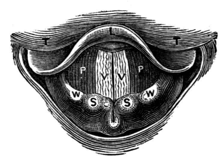 "Physiologists," says Dr. Witkowski,[A] "are quite at issue when they endeavour to determine what kind of instrument the vocal organ resembles; indeed, Galien compares it to a flute, Magendie to a hautboy, Despiney to a trombone, Diday to a hunting-horn, Savart to a bird-catcher's call, Biot to an organ-pipe, Malgaigne to the little instrument used by the exhibitors of Punch, and Ferrein to a spinet or harpsichord. The last-named compared the lips of the glottis to the strings of a violin; hence was given the name Vocal Cords, which they have since retained. The current of air was the bow, the exertion of the chest and lungs the hand which carried the bow, the thyroid cartilages the points d'appui, the arytenoids the pegs, and lastly, the muscles inserted in them the power which tensed or relaxed the cords."[9]