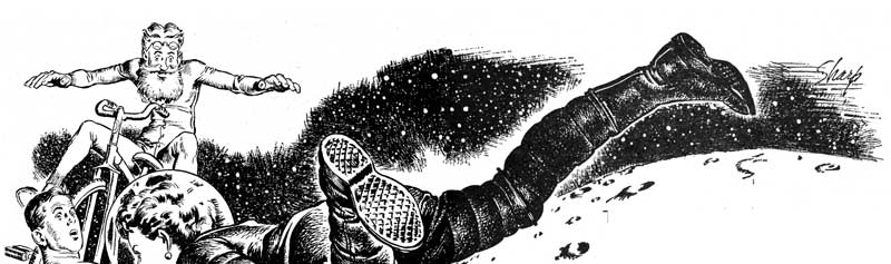 At this, the old man, who was still on his bicycle, whispered to Brad. "They've all got headaches," he nodded, stroking his beard sagebrushly. "It's all part of a great cosmic error—a tragedy played among the spiral nebulae, to the hollow ringing laughter of the gods! You see, we Sloths are only half the population of Kruvny," he went on. "On the other side of our world live the Sidemen, or Sad Sax. Legend has it that eons ago, the Sidemen were mistakenly delivered a cargo of saxophones, from Saks Fifth Avenue." The old man's voice was hushed as he added, "They have been practicing ever since."