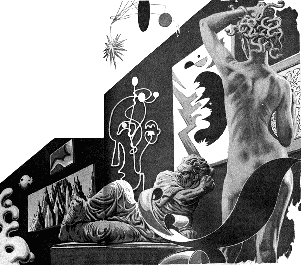 He was right about the backstage part. The Place is a regular theater-in-the-round with the Void for an audience, the Void's gray hardly disturbed by the screens masking Surgery (Ugh!), Refresher and Stores. Between the last two are the bar and kitchen and Beau's piano. Between Surgery and the sector where the Door usually appears are the shelves and taborets of the Art Gallery. The control divan is stage center. Spaced around at a fair distance are six big low couches—one with its curtains now shooting up into the gray—and a few small tables. It is like a ballet set and the crazy costumes and characters that turn up don't ruin the illusion. By no means. Diaghilev would have hired most of them for the Ballet Russe on first sight, without even asking them whether they could keep time to music.